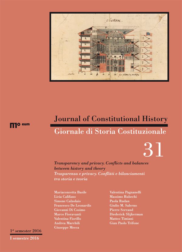 Giuseppe Allegri, Vida Azimi, Gaetano Azzariti, Ermanno Calzolaio, Ronald Car, Riccardo Cavallo, Brecht Deseure, Alberto Febbrajo, Luigi Lacchè, Cesare Pinelli, Tommaso Nicola Poli, Maurizio Ricciardi, Pierangelo Schiera, Luca Scuccimarra, Bui Ngoc Son, Gunther TeubnerTrasparenza e privacy. Conflitti e bilanciamenti tra storia e teoria / Transparency and privacy. Conflicts and balances between history and theoryn. 31 / I semestre 2016Half-yearly journal/Rivista semestrale