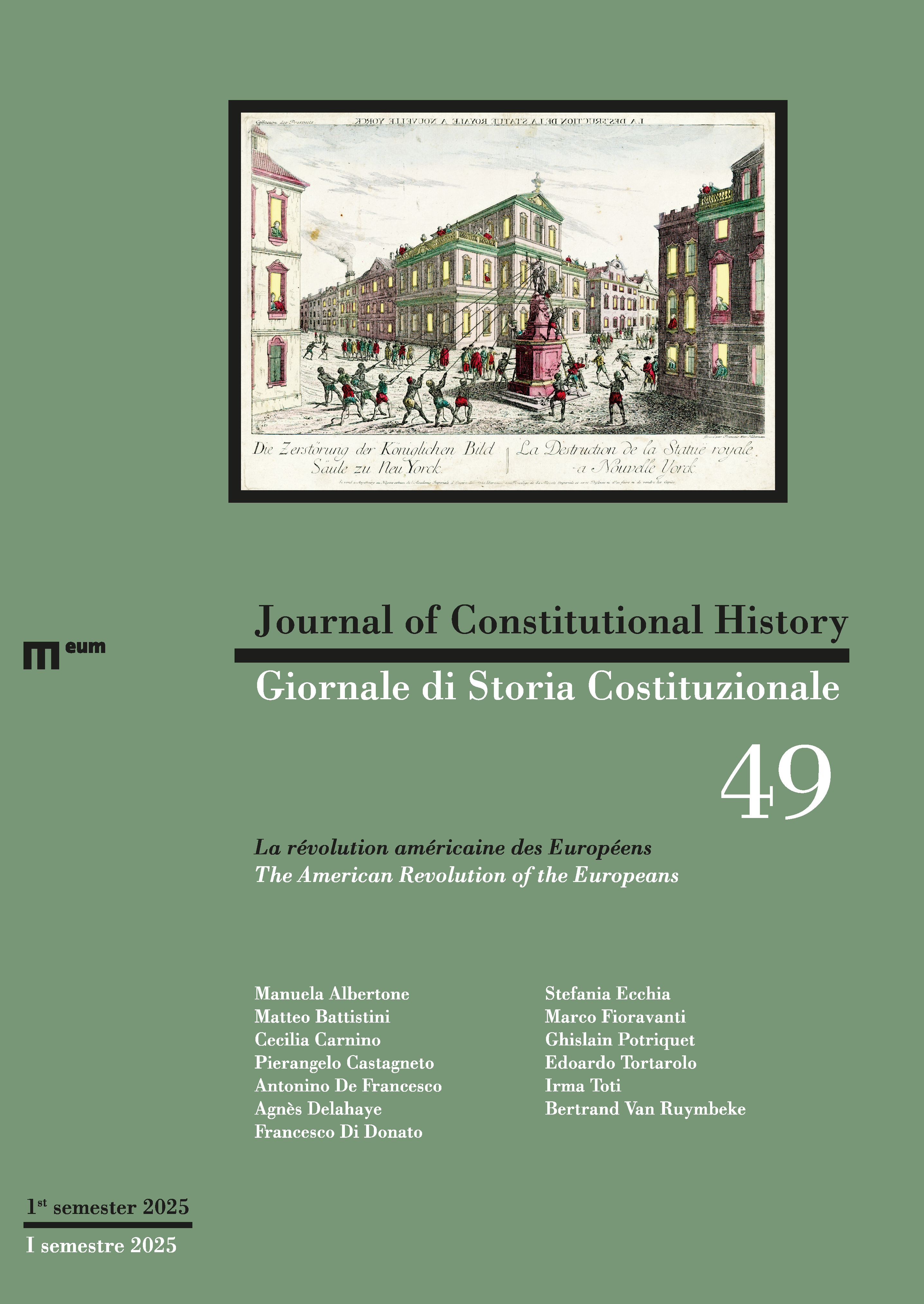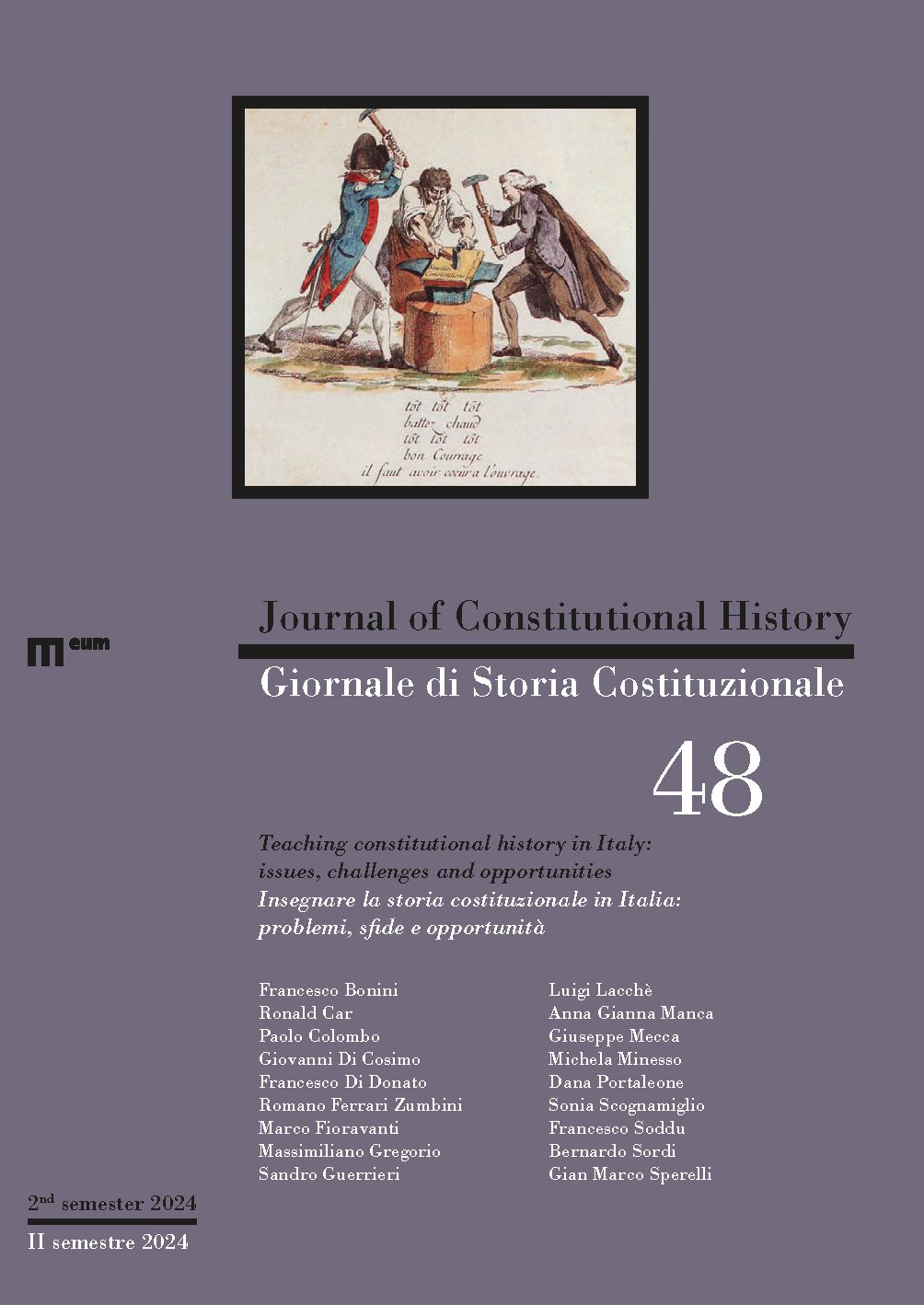 Birgit Aasa, Alessandro Agrì, Filippo Benedetti, Cristina Bon, Ronald Car, Massimiliano Gregorio, Ludovica Di Gregorio, Marie-France Fortin, Xavier Groussot, Luigi Lacchè, Lotta Maunsbach, Giuseppe Mecca, Ulrike Müßig, Andrea Pennini, Raffaella Bianchi Riva, Gian Marco Sperelli, Martin Sunnqvist, Dorota Zabłudowska, Anna ZemskovaVenti anni del Giornale di Storia costituzionale / Twenty Years of the Journal of Constitutional History