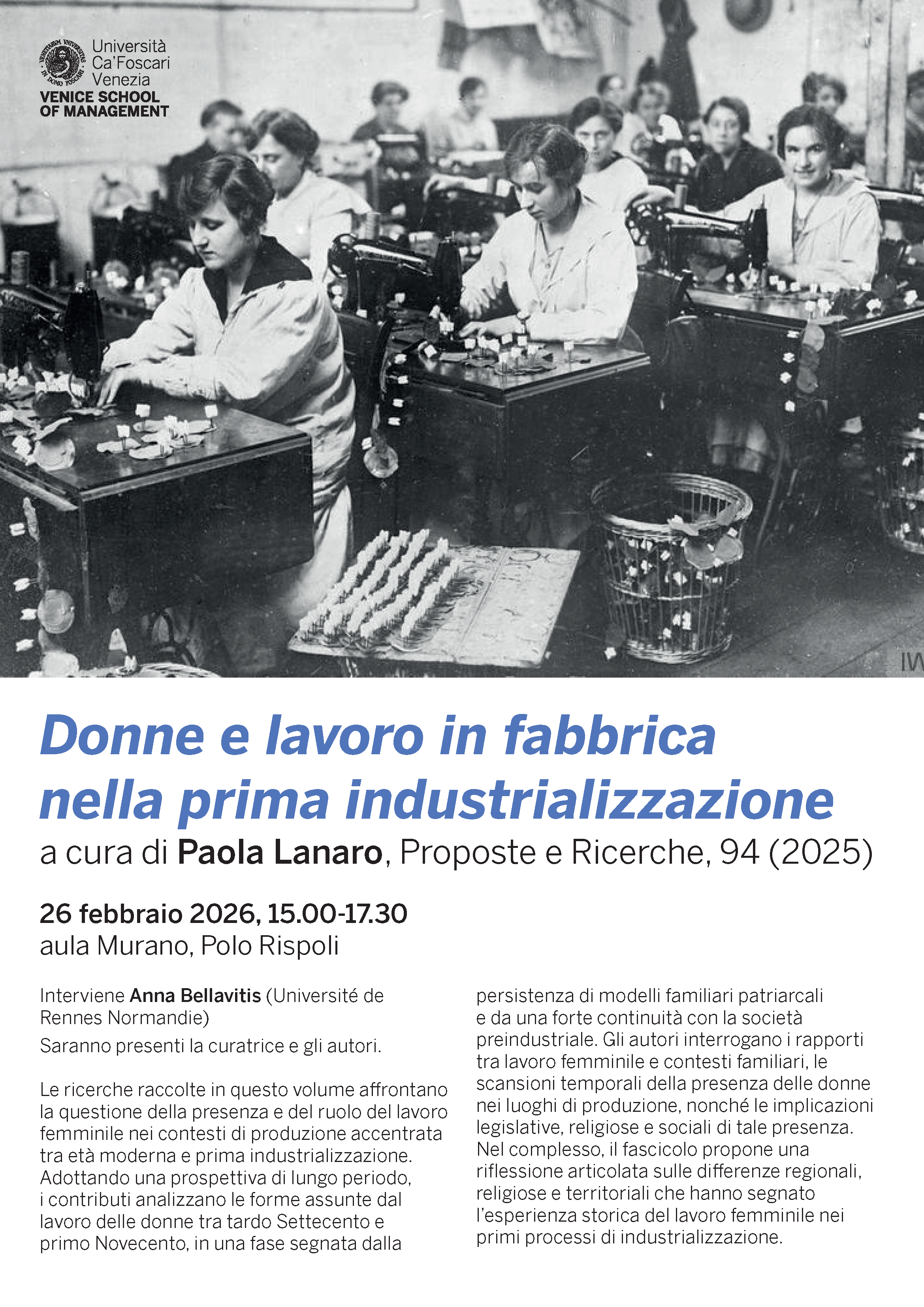La Venice School of Management ospita un incontro dedicato al volume Proposte e Ricerche, 94 (2025), a cura di Paola Lanaro. Le ricerche raccolte affrontano il ruolo del lavoro femminile nei contesti di produzione accentrata tra l'età moderna e la prima industrializzazione.
