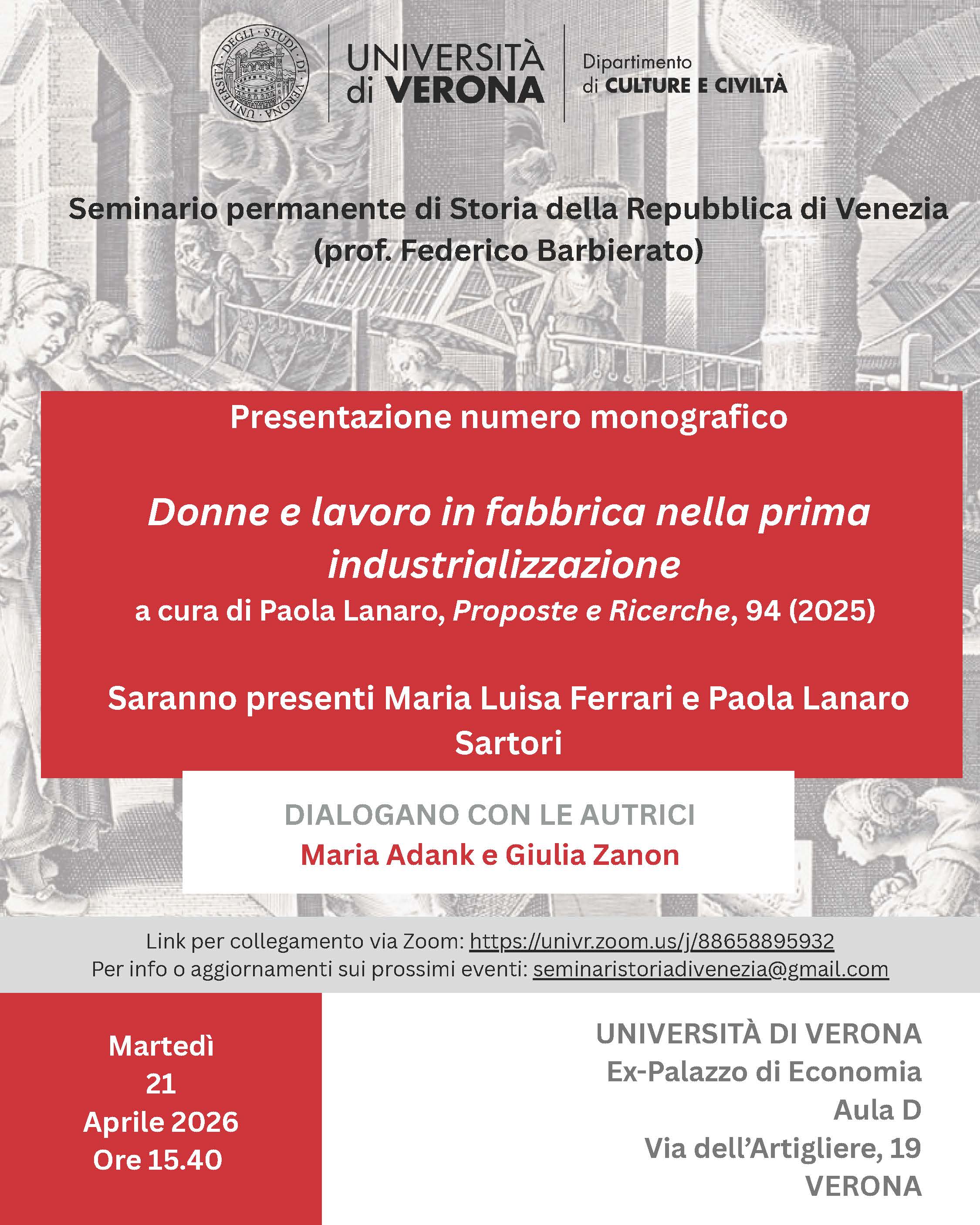 Il prossimo incontro del Seminario permanente di Storia della Repubblica di Venezia avrà per tema la presentazione del numero monografico della rivista Proposte e ricerche, dedicato a Donne e lavoro in fabbrica nella prima industrializzazione. Si terrà martedì 21 aprile, alle ore 15:40, nell’ex Palazzo di Economia dell’Università di Verona.